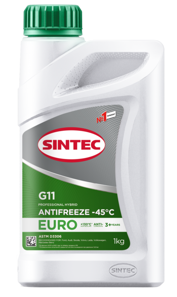 Sintec Antifreeze Euro G11 green -45 создан на основе высококачественного моноэтиленгликоля и импортных ингибиторов коррозии. Обеспечивает правильный тепловой режим эксплуатации двигателя, предотвращает появление коррозии и отложений в системе охлаждения.
