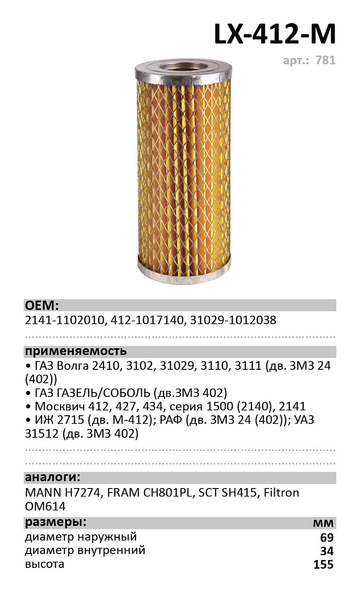 Фильтр масляный, вставка LUXE LX-412-М