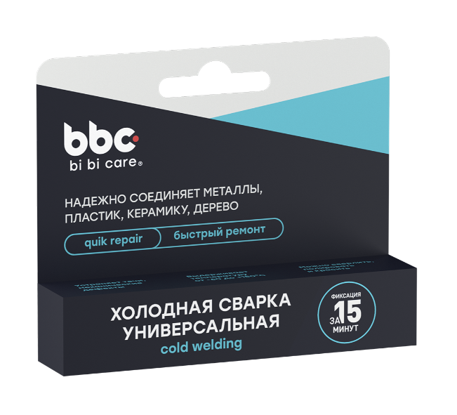 Холодная сварка Универсальная BiBiCare 1751. Двухкомпонентный состав для соединения деталей из черных и цветных металлов, дерева, пластика, стекла, керамики и других материалов. Ликвидирует течи радиаторов, баков, водопроводных труб и т.д. Обеспечивает высокую адгезию к влажным и замасленным поверхностям. Обладает высокой пластичностью. Соединение не уступает по прочности сварному шву.
