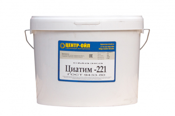 Смазка высокотемпературная ЦентрОйл Циатим 221 – изготавливается на базе кремнийорганической жидкости. В качестве загустителя используется комплексное кальциевое мыло высших жирных кислот и уксусной кислоты. Рецептура смазки содержит антиокислительную присадку. Смазка производится по ГОСТ 9433-80 изм. 1-3. Температурный диапазон применения смазки Циатим 221 от − 60°С до + 150°С.